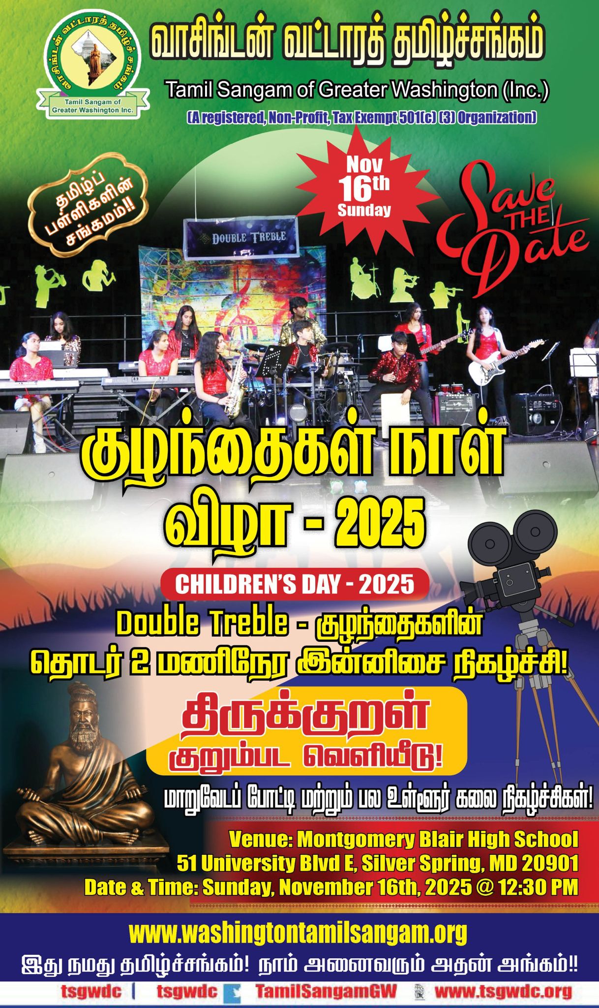 நமது வாசிங்டன் வட்டாரத் தமிழ்ச்சங்கத்தின் “குழந்தைகள் நாள் விழா 2025” வரும் நவம்பர் 16 ஆம் தேதி, ஞாயிறு அன்று மாபெரும் விழாவாக, பல்வேறு போட்டிகளுடன் கொண்டாட இருக்கிறோம்.